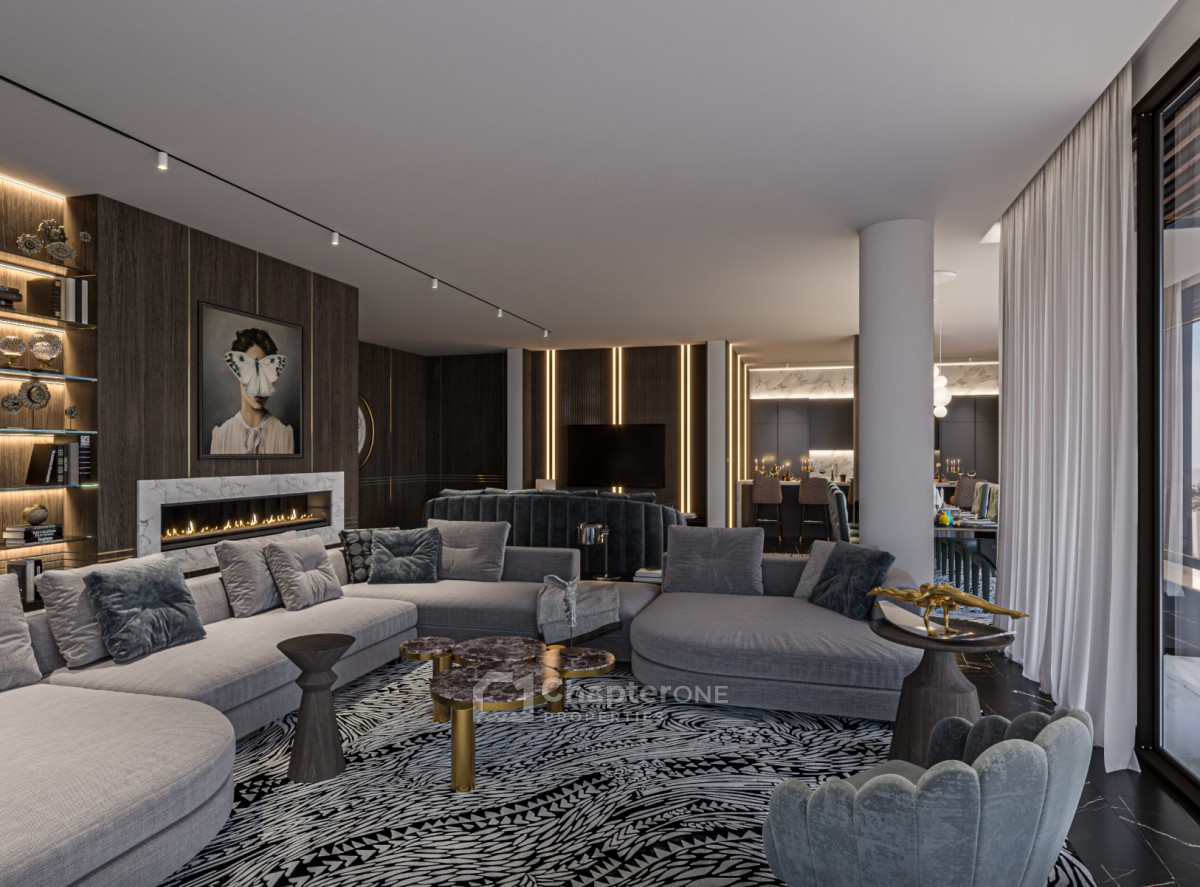 The apartment features a contemporary open-plan kitchen, underfloor heating, and a high-speed elevator for convenient access. A security alarm system ensures peace of mind, while dedicated storage space adds practical functionality to this luxurious home.