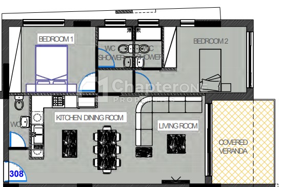 The apartment layout is an open plan kitchen/living/dining room with a private veranda off the living room, two bedrooms, both with en-suite shower rooms, both with built-in wardrobes and a separate guest WC as you enter the apartment. Bedroom one also includes a dual aspect, allowing more natural light into the room.