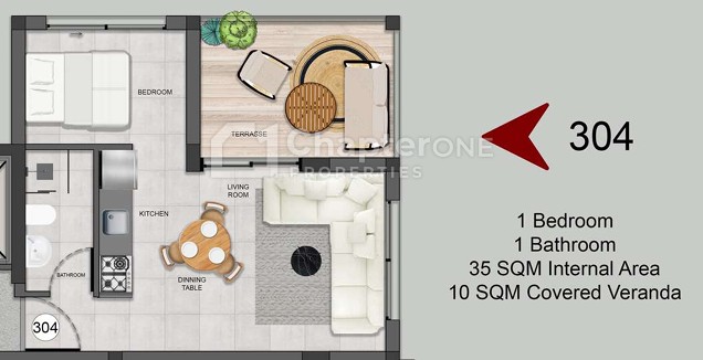 The apartment provides 35sqm of internal living space with a 10sqm covered veranda. The apartment also includes a covered parking space and a storage room.