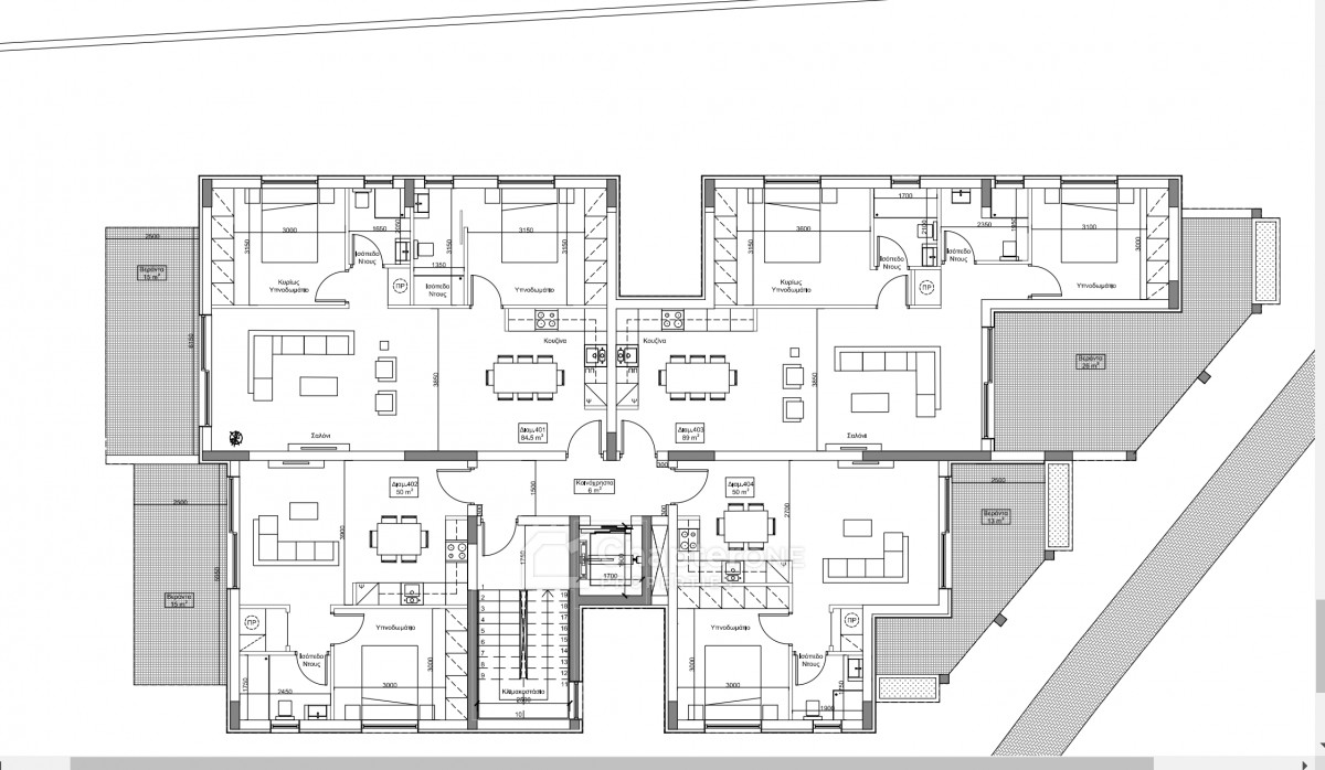 The four-story building consists of 8 one-bedroom apartments and 8 two-bedroom apartments in Agios Dometios.