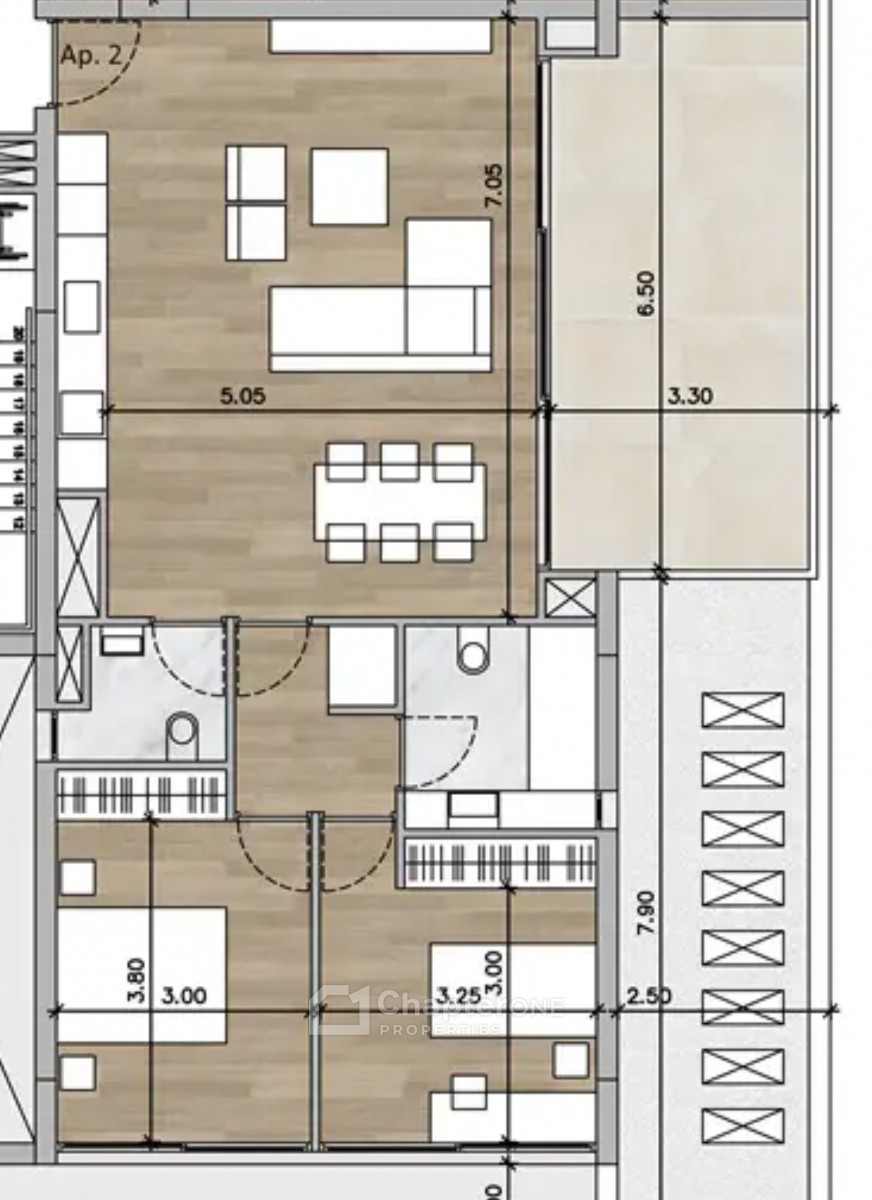 Two bedroom 85m2 first floor apartment with a 21m2 covered veranda in a new project scheduled for completion in September 2026.