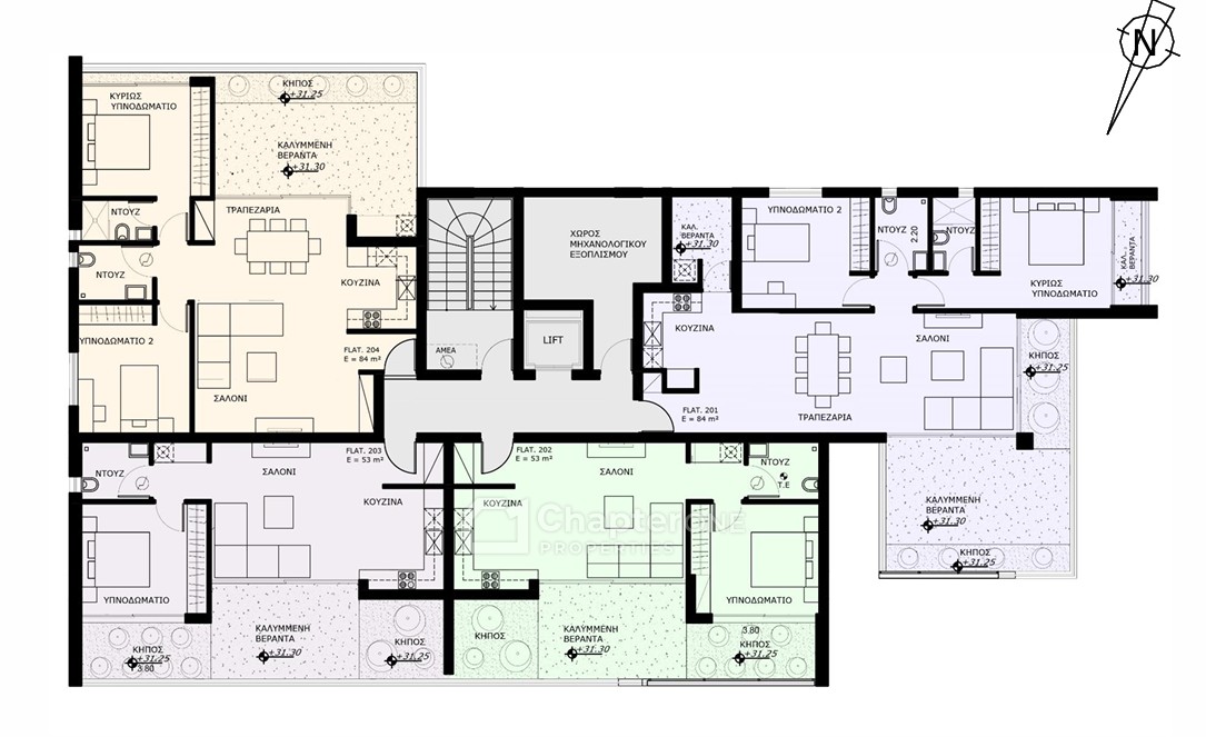 Apt 201 is an 84sqm two-bedroom two-bathroom second floor apartment with a 38sqm covered veranda in this club-style project consisting of 14 apartments, located in the most popular area of Limassol – Potamos Germasogeia.