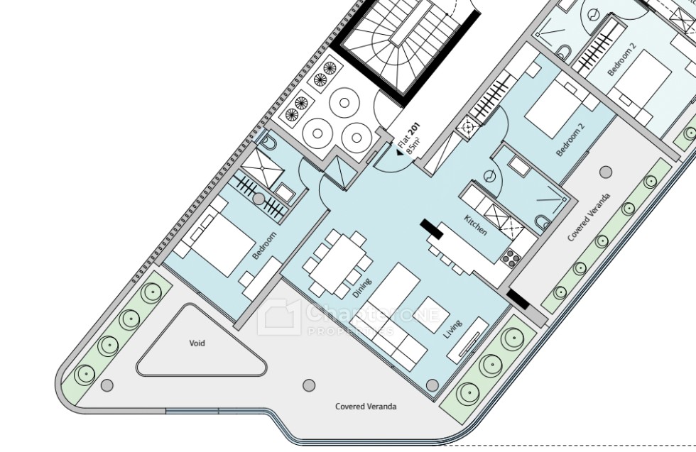 Apt 301 in Block A2 is a two-bedroom two-bathroom third floor apartment with an internal space totaling 85sq.m (915 sq. ft) plus a 32sq.m covered veranda and a 14sq.m covered garden, in a new luxury specification secure gated residential complex in Potamos Germasogeia, Limassol.