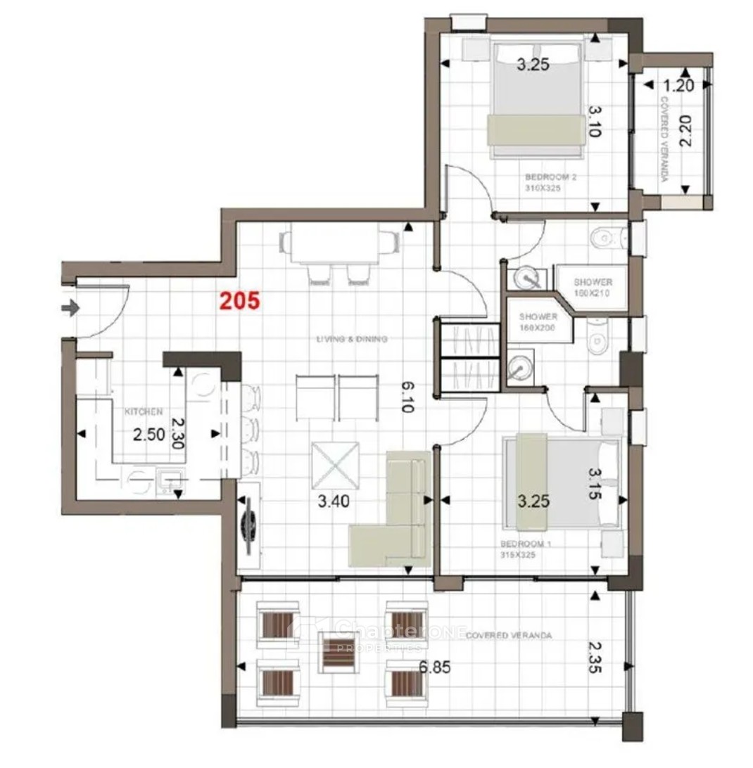 Apartment No. 205 Hibiscus Block is a two bedroom two bathroom second floor apartment in a new project located southwest of the Limassol historic town centre in the Akrotiri Peninsula.