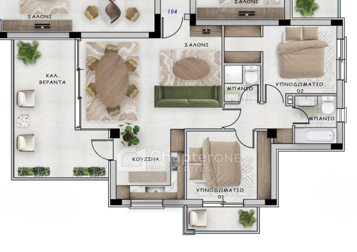 Two-bedroom two-bathroom first floor apartment in a new community development on the outskirts of Limassol.