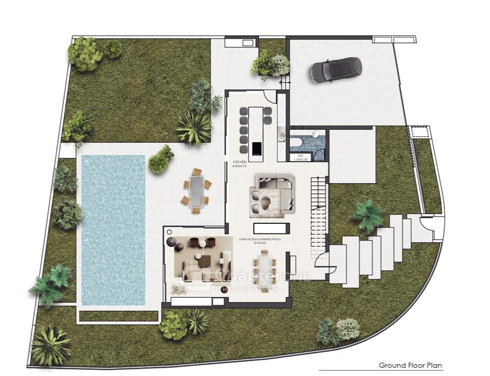 Designed around a modern functionalist architectural concept, this elegant residence seamlessly blends contemporary aesthetics with everyday comfort. Expansive panoramic windows frame uninterrupted garden views, allowing natural light to flow through every living space and creating a strong connection between indoors and outdoors.