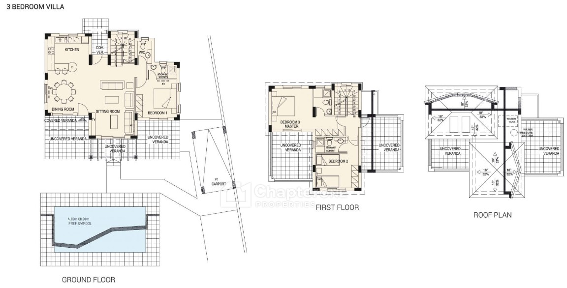 The villa features three generously sized bedrooms, each with its own en suite bathroom, providing a practical and luxurious living arrangement for families or guests. The open-plan living and dining area connects to a fully equipped kitchen, designed for both functionality and style. Large windows and patio doors allow for plenty of natural light, creating a warm and inviting atmosphere.
