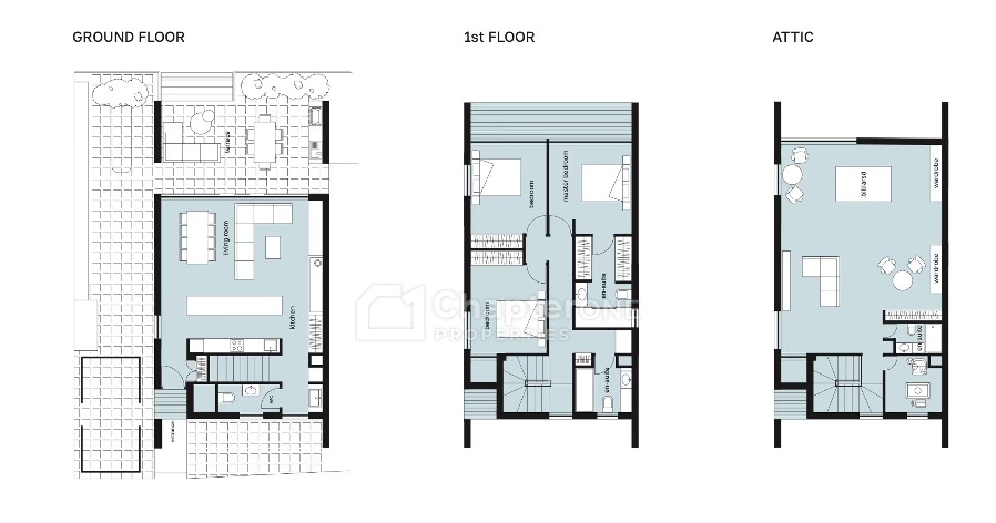 Villa Type A House 1 is a 228sq.m three-bedroom detached house is arranged over 2 floors plus an amazing attic space, with a 30sqm covered veranda and two parking spaces, on a 276sq.m independent plot in the stunning mountainous district of Moniatis above Limassol.