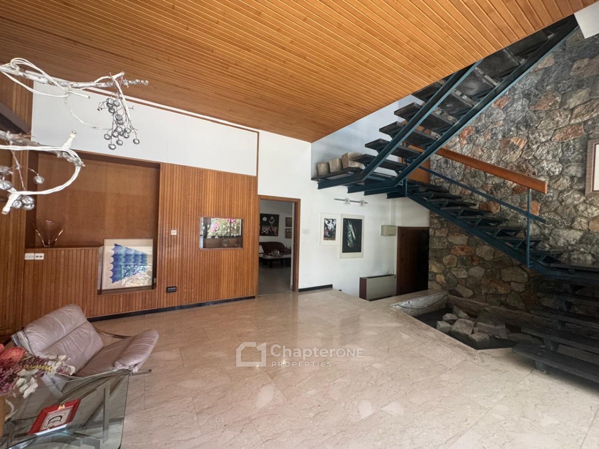 Showcasing exceptional craftsmanship, the residence features a grand living area with a striking, stone-built fireplace as its centerpiece, flowing into a bright, expansive kitchen with a breakfast nook and an adjoining cozy TV lounge. The ground floor also includes a self-contained maid’s room for added convenience.