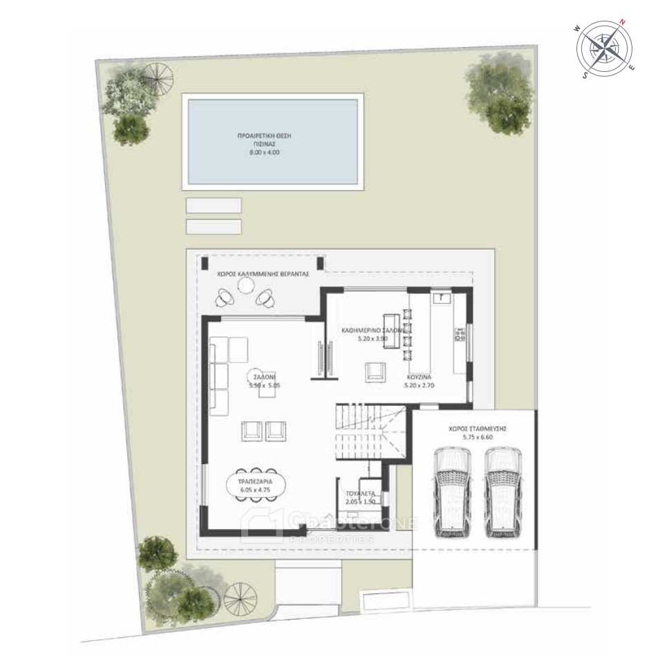 This contemporary-designed detached house is located in the desirable area of Archangelos. It sits on a 529 sqm plot and boasts a spacious and functional internal layout with a total internal area of 240 sqm, including 38 sqm of covered veranda space. The property also features a large garden and a double covered garage.
