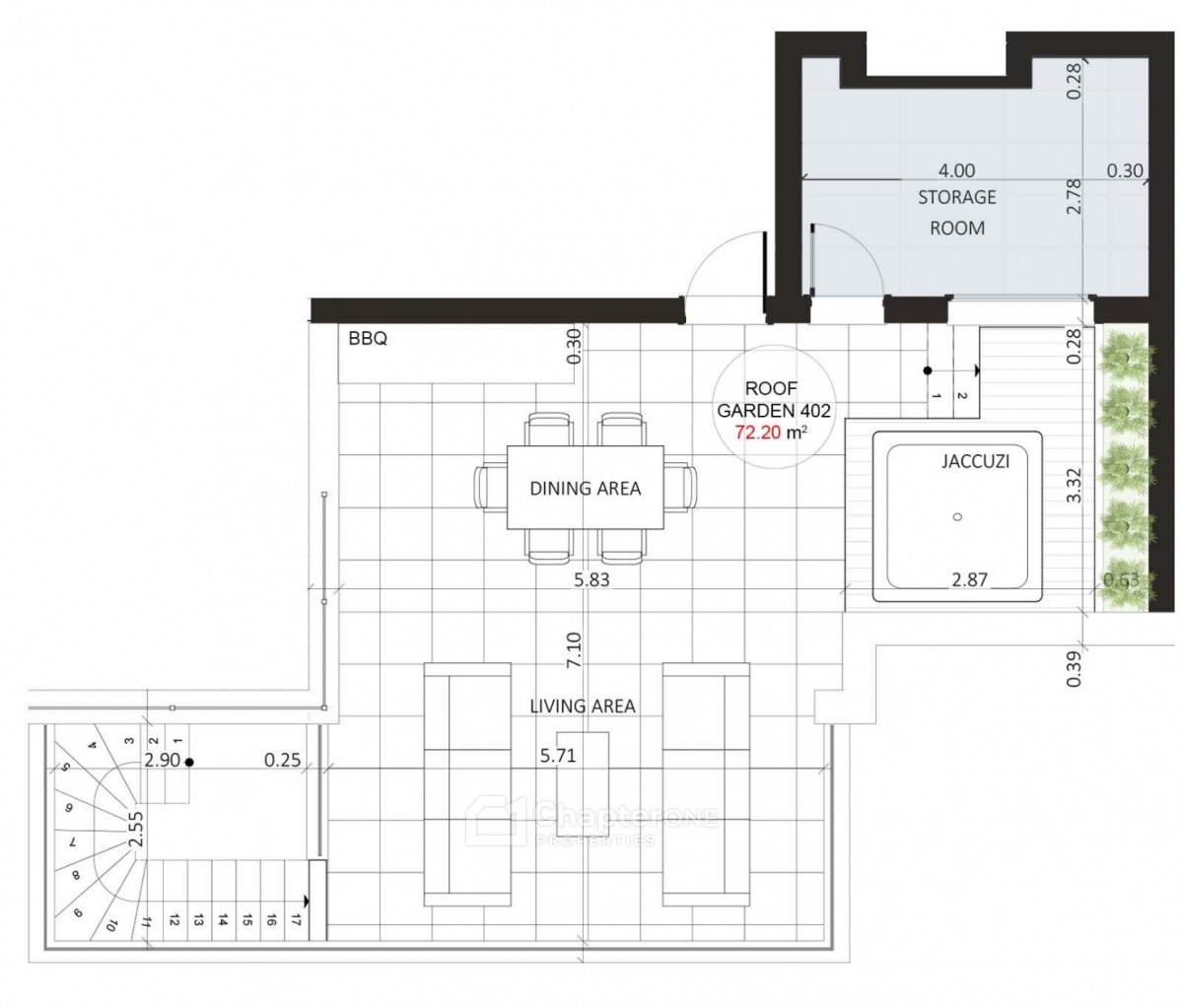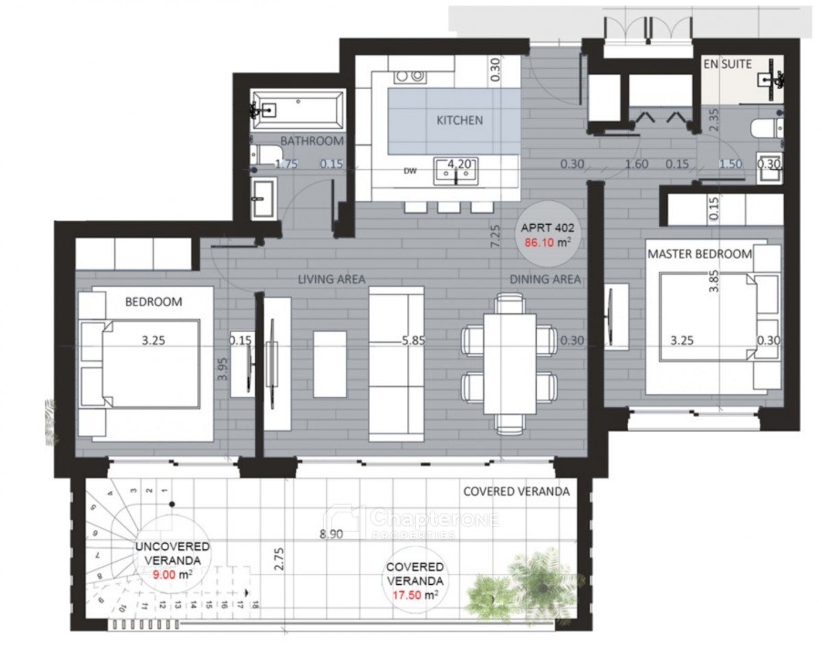 86m2 two bedroom penthouse apartment with 17.5m2 covered veranda, 9m2 uncovered veranda plus an amazing 80m2+ private roof garden.