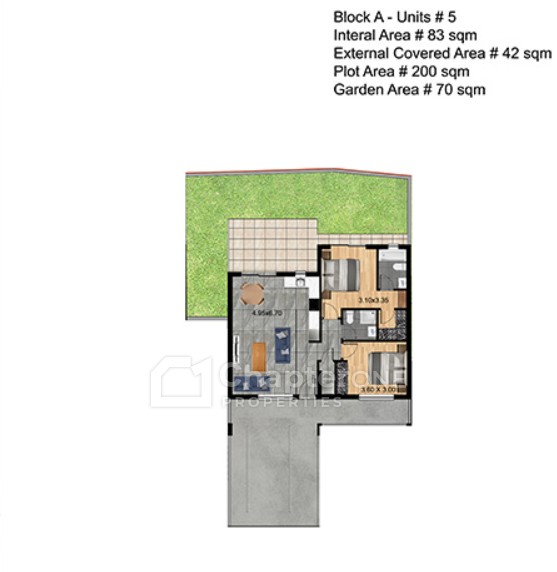 83sqm two-bedroom two-bathroom plus guest WC ground floor maisonette with a 42sqm covered veranda, off-street parking and 70sqm private garden, in a new gated community development within the boundaries of the very sought after and popular Parekklisia Village.