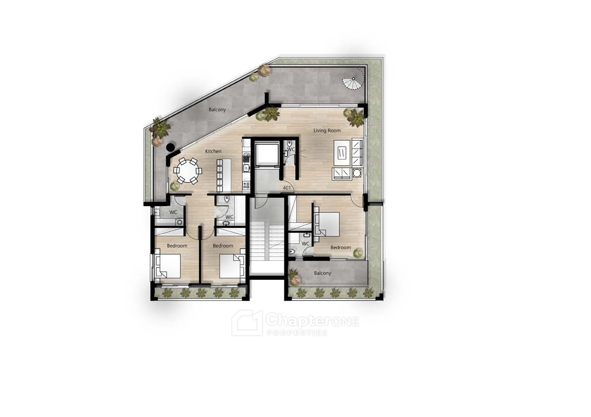 Three-bedroom penthouse apartment, showcasing a minimalist design and smart functionality to create a peaceful, modern lifestyle surrounded by nature.