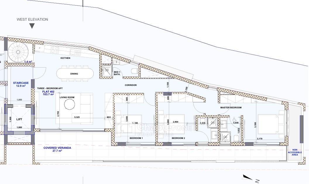 Apt 402 is a fourth floor three-bedroom penthouse apartment in a modern four-story building with 11 stylish apartments.